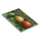 Este incrível notebook apresenta uma fotografia de um monte de tomate amadurecendo, incluindo um tomate vermelho, laranja e verde de cereja em uma linha, crescendo em uma fábrica de tomate em um jardim suburbano. A fotografia foi tirada usando macro fotografia para um resultado detalhado.