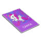 Acompanhe suas notas importantes com este lindo notebook unicórnio. Este design apresenta uma imagem de um adorável conjunto de unicórnios contra um fundo brilho rosa e roxo. Adicione seu nome a este produto com a ferramenta fácil de usar.