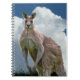 Fotografia de um canguru macho sobre fundo do céu azul e nuvens inchadas.