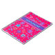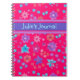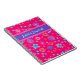 Um bonito notebook espiral ou Diário para você personalizar, com um padrão de flores em roxo, turquesa, rosa e laranja sobre fundo rosa-batom, a partir de uma colagem de papel pintada à mão por Judy Adamson. Você pode mudar facilmente a cor do plano de fundo, se desejar, usando o botão Editar.
