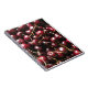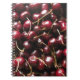 Fotografia das cerejas vermelhas que se estendem aos bordos do bloco de notas.