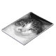 Fotografia em tons de cinza de um gato branco e de mesa cortada para mostrar a face mais próxima.