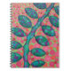 Notebook artístico com um design ousado e abstrato de um campo de flores atrás de uma videira folhada feita de muitas manchas brilhantes.