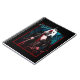 Harley Quinn em frente a samambaias verdes em uma fronteira vermelha.