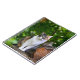 Um gato se senta no jardim verde, próximo a um tronco e olha à frente