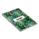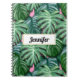 Um caderno espiral personalizado feito com uma imagem de folhas tropicais verdes, peludas, grandes e peludas, com um salto cor-de-rosa atrás. Pintado com acrílicas e digitalizado. Um quadro branco com uma borda falsa de folha de ouro colocada sobre cima com seu nome escrito dentro.