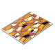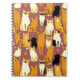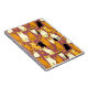 Notebook em um padrão lúdico de gatos estilizados em tons quentes de gengibre, creme, preto e marrom em um fundo marrom caramelo. Cada gato tem sua própria expressão e marcas bonitinhas, com pequenas pegadas espalhadas por toda parte.