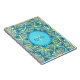 Um notebook colorido com um belo e brilhante padrão floral de mandala azul, amarelo e turquesa, com um monograma no centro. Perfeito para instrutor ou centros e curadores de ioga. Este Mandala representa a Terra, o Céu, e o nosso adorável Sol. Um tributo às maravilhas da Criação que aquecem os nossos corações e nos dão esperança de criar um amanhã melhor. Desenhado à mão e pintado pelo SunFreeStar.