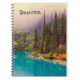 Um notebook espiral com uma fotografia cênica do norte como pano de fundo. Um lago cor de turquesa com uma floresta de pinheiros ao fundo e um céu nebuloso nebuloso que lhe dá uma qualidade mística mágica. Personalizar com um nome ou outro texto.