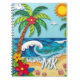 A coastal monogrammed notebook in a paper quilling style ai illustration of two palm trees, the sun, ocean waves, a beach and tropical flowers.