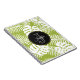 Bloco de anotações espirais com um padrão repetitivo de folhas de palma grandes sobre fundo verde-oliva. Trendy moderno e tropical.Um círculo negro com uma borda interna dourada, colocada sobre cima com sua dentro de detalhes personalizados.