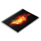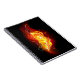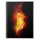 Pena de pavão brilhante feita de fogo e chamas sobre fundo negro.