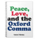 Paz, Amor, e o Coma Oxford. Um hilário notebook personalizado com o uso adequado da vírgula de Oxford. Esta engraçada piada gramatical será um sucesso com um professor ou escritor de literatura inglesa que gosta de humor de pontuação.