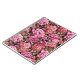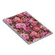 A vibrant array of pink and orange peonies is artfully arranged against a dark background, creating an eye-catching and colorful floral pattern. The detailed blossoms are interspersed with rich green leaves, enhancing the lush appearance.