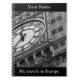 Um notebook viagem com uma vista de perto do Big Ben, o icônico relógio de Londres, em preto e branco. Pode ser personalizado com o seu nome, e pode alterar o texto na parte inferior "Os meus viagens na Europa" para as suas próprias palavras.