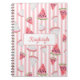 Notebook divertido e com design frutado, perfeito para adolescentes. Padrão de melancia, sobre fundo listrado de cor rosa e branca. Personalize, adicionando o nome especial das meninas.