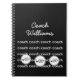 XC Cross Country Coach notebook gift in black and white. The word coach is patterned on the front with script typography for the name. A trio of arrow emblems round out the decoration on a black background.