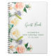 Um livro convidado ou planejador de festas para uma festa de aniversário 50ª (ou qualquer idade). Decorados com flores de verão grandes, lixadas, de cor aquosa, rosas florais e pedras em branco, coral e ouro rosa. Fundo branco chic. O título: Guest Book é escrito com um moderno script de estilo escrito à mão.