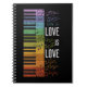 Ilustração de piano abstrato arco-íris com notas de música arco-íris e decoração de design de texto "Amor é Amor"