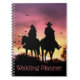 Um lugar excelente para anotar todas as suas ideias para o seu casamento perfeito. Esta vaqueira e vaqueira ocidental do país no pôr do sol com o caderno de cavalos faz um ótimo planejador de casamento.