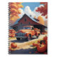 Colheita de Abóbora de outono com Caminhão de Pickup, folhas de queda e abóboras por toda parte.