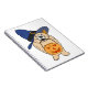 Whimsical cartoon dog in a wide wizard hat carries a glowing jack-o'-lantern. Bold lines, warm autumn colours, Halloween vibe, ideal for playful apparel and festive gifts.