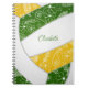 Esse bonito notebook temático de vôlei apresenta a imagem realista de um vôlei de tamanho abstrato que tem painéis verdes, dourados e brancos com delicadas flores de rabo desenhadas à mão, penas e paisagens em branco, padronizado nos painéis verde e de ouro do vôlei - personalizados com o nome do atleta - por katz_d_zynes