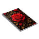 Composição floral bem projetada, com rosas vermelhas grandes e vibrantes intercaladas com flores e folhas de ouro mais pequenas