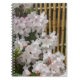 Um notebook com tamanho pessoal, encadernado espiral, para anotações e revistas que apresenta uma foto cobrir de flores brancas de rododendron crescendo ao longo de uma cerca de bambu ornamental. Um design floral adorável!