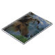 Foto parcialmente transparente da minha prateleira com vista para um lago e bela paisagem.