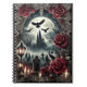 This image shows a landscape inspired by the Gothic aesthetic, combining dark tones, dramatic contrasts, roses and decorative details. In the center of the picture is a mystical castle in the light of the full moon, a cemetery in the foreground and red roses framing the view. The black birds flying in the background add a dark atmosphere to the scene.