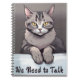 Notebook em ilustração de uma cinza de aparência estéril por gato com olhos amarelos piercing descendo suas patas frontais sobre uma borda, mirando diretamente para a frente com um ar de autoridade séria. Abaixo do gato, o roteiro ousado diz, "Precisamos conversar", acrescentando humor e drama.