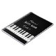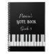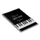 Notebook com teclado de piano e script branco personalizável sobre fundo preto. Bom presente para um estudante de piano ou professor.