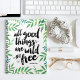 Todas as coisas boas são selvagens e livres. Design apresenta a citação em texto preto nítido de pincelada rodeado por folhas botânicas verdes da selva em aquarela.