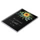 Um fundo negro. Decorado com girassóis, eucalipto verde. Adicione um nome, texto. O nome é escrito com um moderno estilo escrito à mão com traços. Para manter as hastes, exclua apenas o nome da amostra, deixe os espaços ou emoji na frente e depois do nome.