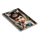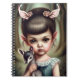 Perdida em um mundo de imaginação e amor. Uma jovem menina está segurando um cervo em seus braços. A menina está vestindo um vestido azul e tem um par de chifres na cabeça. A cena é ambientada em uma floresta, com árvores ao redor da menina e do cervo