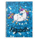 Este bonito notebook azul apresenta um pequeno unicórnio gordinho, saltando para alegria sobre uma cama de brilho azul. Ela tem cascos ouros e cornos dourados correspondentes, cabelo e cauda coloridos do arco-íris, estrelas douradas em seu corpo, todas num brilhante fundo azul, brilhante. Observe que este lindo notebook unicórnio pode ser personalizado com seu próprio nome.
