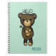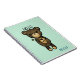 Um caderno espiral com uma simples ilustração de um ursinho marrom de desenho animado segurando uma margarida amarela. Olá, escrito sobre a cabeça dele. Personalize com um nome.