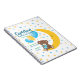 Bela e colorida estátua de nascimento de um bebê com um adorável desenho animado de ursos peludos com uma fita arco azul sobre uma lua dormindo segurando balões em estrelas amarelas e azuis e coloridas. Adorável, o bebê nasceu é arte. Fácil de personalizar substituindo o nome e os detalhes.