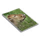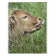 Um lindo bezerro bonito deitado em erva longa com a língua saindo.