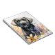 Pintura em aquarela esplêndida de um design preto Labrador Retriever Puppy com flores silvestres roxas, vermelhas e amarelas