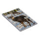 Veado vermelho selvagem em uma paisagem florestal com neve com o pano olhando diretamente para a câmera.