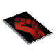 This striking notebook features a powerful clenched fist design, utilizing a bold red color palette. The graphic incorporates a vintage halftone dot pattern, creating a retro pop art aesthetic with high-contrast shadows and thick outlines. This stencil-style silhouette represents themes of strength, unity, and solidarity through a minimalist visual language. Perfect for those seeking an iconic and impactful look, the design offers a textured, underground press feel that stands out on any apparel.
