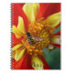 Um notebook de tamanho pessoal, encadernado em espiral, que apresenta a foto do cobrir de uma mosca Hover, em preto e amarelo, listrada, em uma flor de colarinho laranja e amarelo. Um design floral adorável! Use como diário ou para fazer anotações.