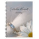 Personalize o Notebook Espiral de Casamento de Margarida Branca bonito com os nomes pessoais da noiva e do noivo e a data específica da cerimônia de casamento para criar um livro de hóspedes, um livro de conselhos ou um diário para acompanhar suas notas de planejamento de casamento. Este clássico livro de notas botânicas personalizado apresenta uma fotografia floral melhorada digitalmente de um colar branco de flores margaridas, colar branco de pérolas, anel de noivado de diamante e conjunto de bandas de casamento com um fundo de cinza leve.