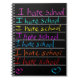 Escrita néon "Eu odeio a escola" na página de um caderno preto.