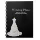 Caderno espiral elegante feito em preto e branco. Foto bonita de um vestido nupcial branco contra um fundo do negro como o azeviche. O texto branco é inteiramente customizável. Personalize o texto para ler o que você quer. Aperfeiçoe para o planeamento héctico da noiva.