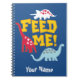 Traga um pouco de humor para sua papelaria com este caderno de dinossauro engraçado com fundo azul real e três silhuetas de dinossauro. O texto em negrito 'Alimente-me' em amarelo, acentuado com efeitos de costura falsa, adiciona um toque divertido. Personalize-o para um presente único!