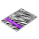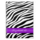 Um teste padrão preto & branco do impressão da zebra com uma listra horizontal roxa do inclinação personalizada com seu nome em um caderno feito sob encomenda do espiral-limite.