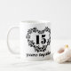 Esta 15a caneca bonita do presente do aniversário manda 15 anos junto citar com um logotipo bonito do coração do filagree para comemorar sua ocasião especial. Consiga duas canecas como um presente para que o casal feliz comemore seu amor. De nossa coleção dos aniversários.